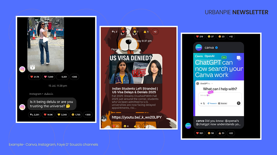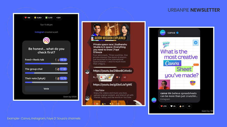 This model is already being operationalised across several leading platforms. Journalist Faye D’Souza uses Instagram Broadcast Channels to share sensitive news with her 50K+ audience, where reactions serve as real-time sentiment indicators. Her approach transforms viewers into stakeholders by offering space to react to emotionally charged updates—such as aviation accidents or governance issues. Similarly, Instagram itself has tested its own audience with candid polls, asking users about their on-platform behaviour. These self-reflective prompts—seen by nearly half a million viewers—demonstrate how even platform giants can use humility and curiosity to strengthen bonds. Canva has adopted a storytelling approach through its broadcast group, mixing event footage with community shout-outs, reinforcing its image not as a product, but as a partner in user creativity.